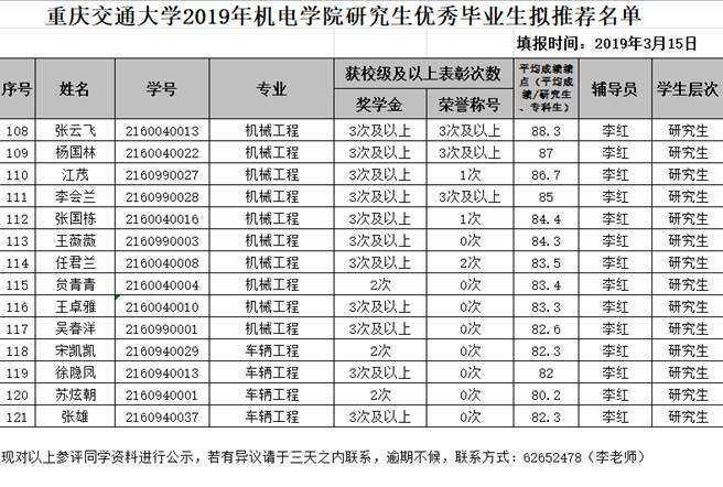 根据《重庆交通大学学生手册》(2018年版)中《重庆交通大学学生奖励办法(试行)》的有关规定和《关于开展2019年校级及市级优秀大学毕业生和优秀毕业研究生评选推荐工作的通知》精神,经学生个人申报、班级推荐、学院初审、公示,拟推荐张云飞等14名同学为2019年重庆交通大学优秀毕业研究生候选人。