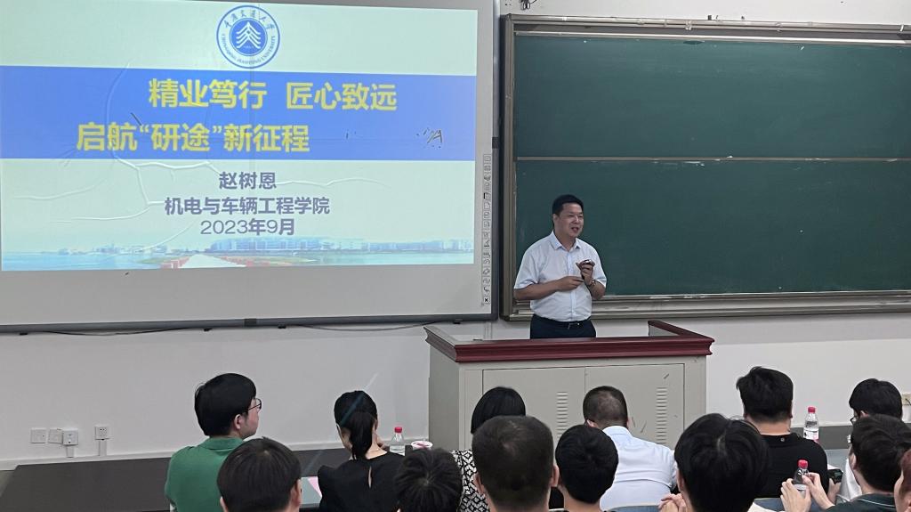 院长赵树恩教授以“精业笃行、匠心致远,启航‘研途’新征程”为题,给同学们介绍了学院历史、发展历程和现状,以及学科特色优势和发展机遇,希望同学们尚德明责、慎思明辨,勇于创新、筑梦机电。